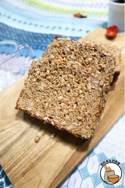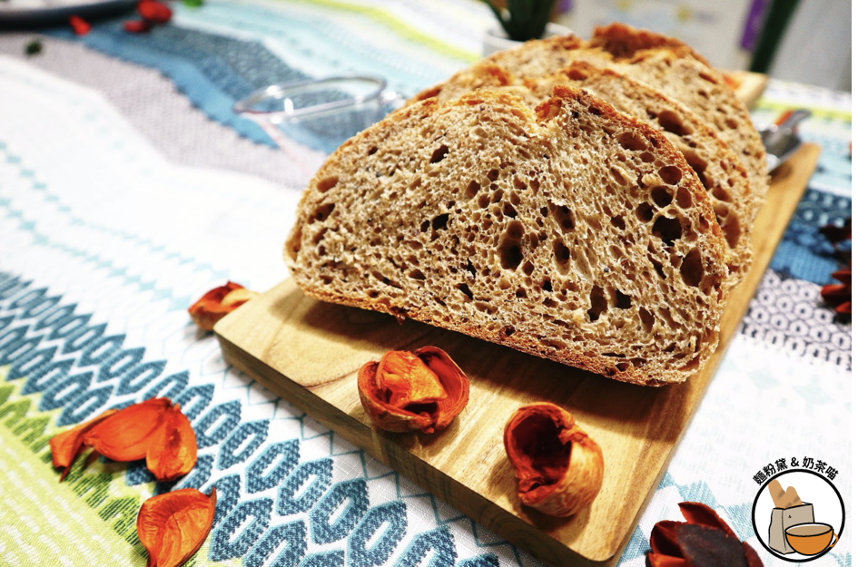 👄 品嚐看看 : 麵包和未磨碎丁可的比例吃下去感覺差不多一半一半,剛好讓口感上不會太過乾澀,還是會咬得到麵包的部分,也會吃到一顆一顆榖物的口感,帶著一點酸麵包味道~整個麵包真的是100%的全穀物製作,麵粉黛吃完一片都會覺得超飽,也很適合塗個發酵奶油一起吃~