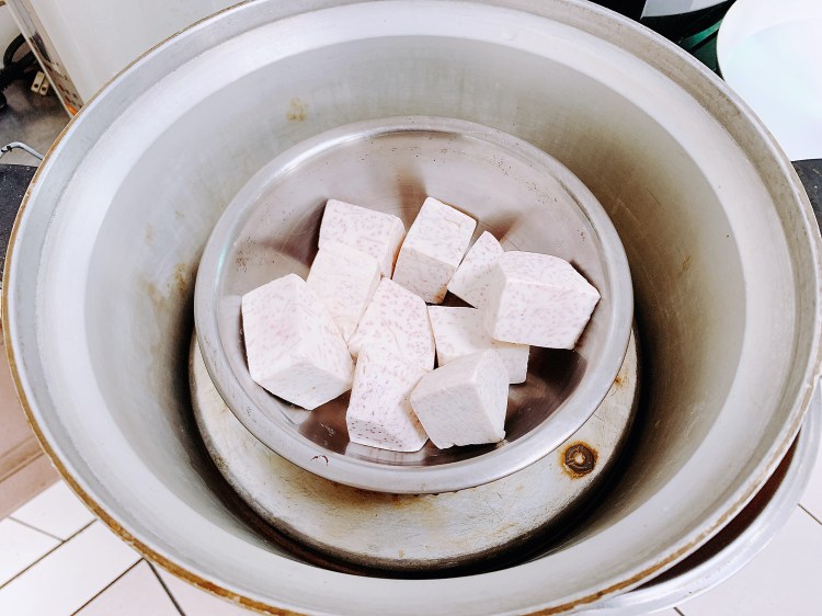 1.把切塊芋頭放入有點深度的小鍋中,倒入一碗水到電鍋中,先將芋頭蒸熟