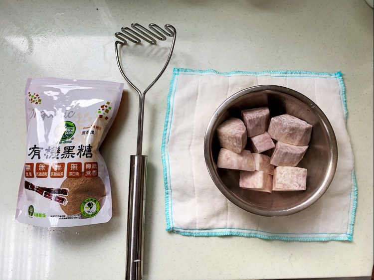 2.先準備好黑糖,樹薯粉,鮮奶放置一旁,將芋頭從電鍋中拿出 ,趁熱加入2~3大匙黑糖,用搗泥器或湯匙壓成芋泥,邊搗邊分2-3次加入樹薯粉,攪拌到均勻就可以了~(如果喜歡保留一點芋頭顆粒的話,記得不要搗到全都是芋泥狀)