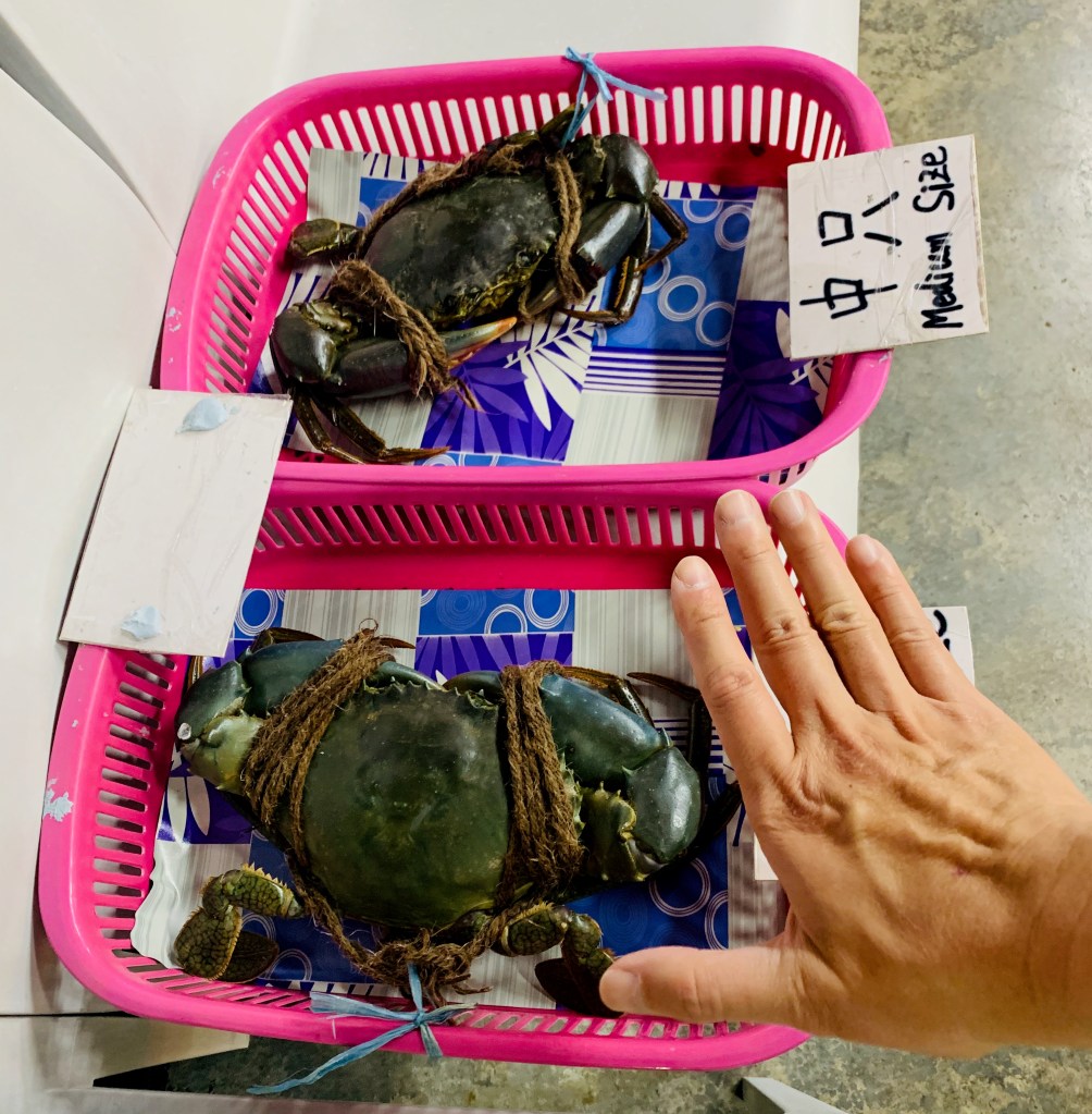 進入店家門口後,會看到旁邊有螃蟹的展示品,大隻的螃蟹尺寸真的滿驚人的,螃蟹身高跟成年男生的手一樣大,中隻的尺寸就跟在台灣常看到大隻螃蟹的尺寸差不多。