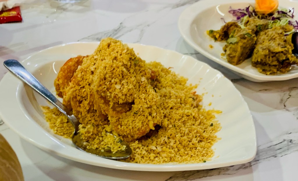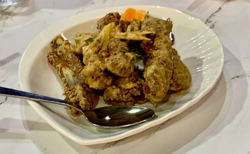 上方的炸麥片吃起來是甜甜的口味,跟台灣的避風塘炒蝦很類似,炸麥片配著炸蝦子非常地涮嘴。