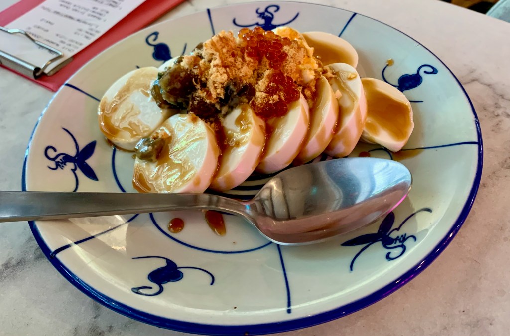 這一道是店內的創意小菜,冷盤嫩豆腐上方灑上魚卵+肉鬆+皮蛋,再淋上醬油膏,感覺像是台灣的皮蛋豆腐加強豪華版,配著咬下魚卵的瞬間,會有波波的口感是讓整道菜滿特別的,我自己回家後也會去買魚卵和皮蛋豆腐自製這道料理。